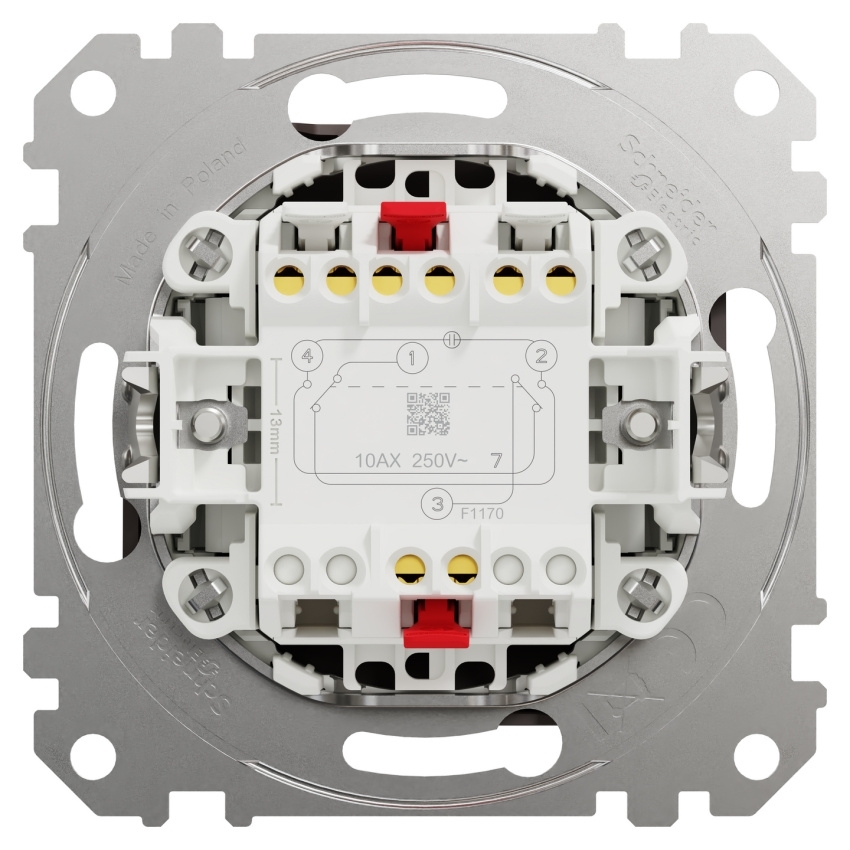 Křížový spínač Schneider Electric Sedna Design Elements SDD181107U je určen pro zapuštěnou montáž a je vyhotoven v elektromechanickém provedení. Je vybaven bezšroubovými svorkami, které umožňují snadné připojení vodičů a zjednodušují instalaci. Povrchová úprava v dekoru dřeva wenge s polomatným vzhledem dodává spínači elegantní a moderní charakter. Přístroj pracuje při jmenovitém proudu 10 AX a napětí 250 V AC s frekvencí 50 Hz. Odolné provedení z polykarbonátu a rozměry 73 × 73 × 37 mm umožňují instalaci do standardních krabic, zatímco stupeň krytí IP20 je vhodný pro interiérové použití.