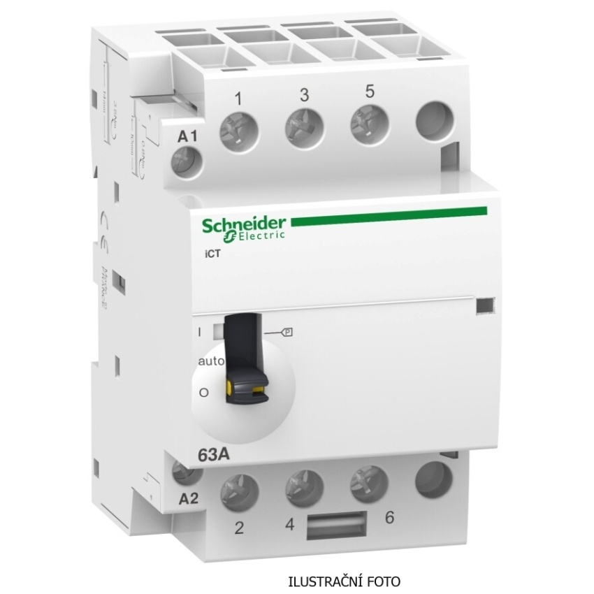 Toto Acti9 iCT je modulární stykač. Zařízení pro dálkové a manuální ovládání 3P s 3 normálně otevřenými kontakty. Jmenovitý proud je 40 A pro AC-7a a 15 A pro AC-7b. Hodnota provozního napětí Ue je 400 VAC. Řídicí napětí Uc je 220 V stř. až 240 V stř. Toto zařízení lze použít pro ovládací obvody. Toto zařízení lze použít pro dálkové spínání osvětlení, malé motory (ventilátory, mixéry) nebo HVAC systémy. Je kompatibilní se všemi pomocnými zařízeními klimatizace Acti9, pro aplikace osvětlení, vytápění a ventilace. Tento produkt je v souladu s normou IEC/EN 61095. Elektrická životnost až 100 000 cyklů pro AC-7A nebo ACU-1 30 000 cyklů pro AC-7C, AC-7B, AC-3, AC-5A nebo AC LC-5B Maximální počet sepnutí je 100 za den. Jmenovité izolační napětí Ui je 500 VAC. Impulzní výdržné napětí Uimp je 4 kV. Stupeň znečištění je 2. Lze ji upevnit na lištu DIN. Jeho šířka je 6 náklonů 9 mm. Barva produktu je bílá (RAL9003). Rozměry jsou (Š) 85 mm x (V) 54 mm x (H) 60 mm. Podle normy IEC 60529 je stupeň ochrany ve skříni IP20 a IP40. Provozní teplota je od -5 °C do 60 °C. Skladovací teplota je od -40 °C do 70 °C.