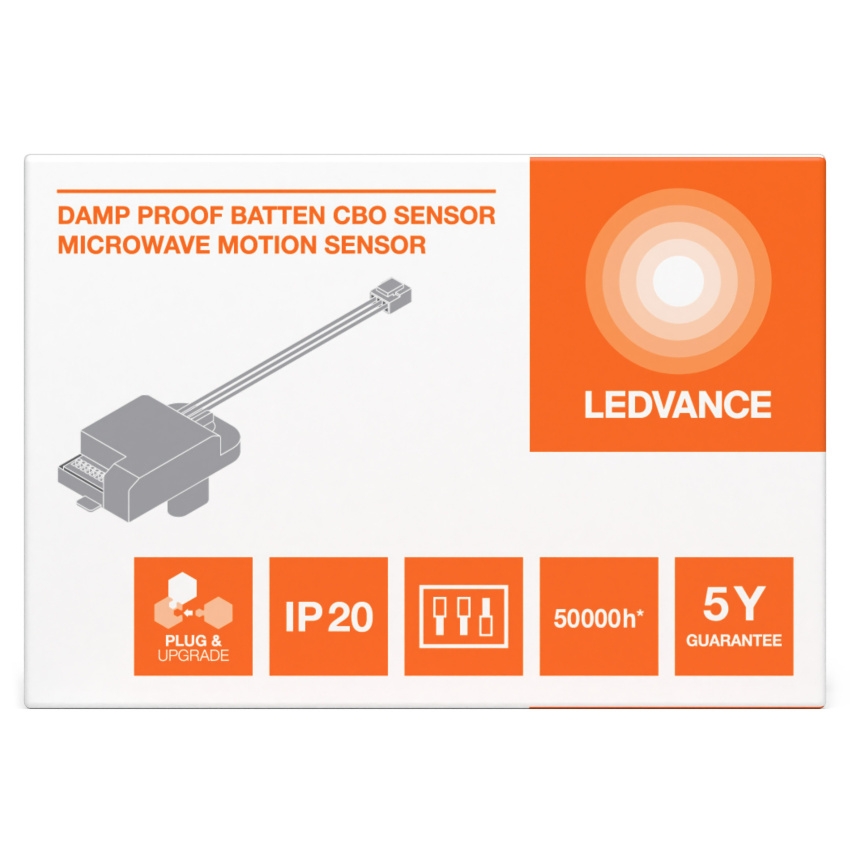 Mikrovlnný senzor LEDVANCE DP BATTEN CBO SENSOR LS PD 8 MW INT rozšíří standardní svítidla DP CBO (ON/OFF) o automatické spínání díky konceptu Plug & Upgrade. Nabízí vícenásobné nastavení pomocí DIP přepínačů – dosah detekce, prah denního světla, dobu sepnutí i úroveň/periodu DIM (podle kompatibility svítidla). Instalace je rychlá a bez nářadí díky bezšroubovým svorkám; nízký příkon 0,36 W, robustní tělo z PC a krytí IP20 zajišťují spolehlivý provoz v interiéru. Senzor pracuje v teplotním rozsahu −20 až +50 °C, má dlouhou životnost až 50 000 h a je certifikován podle CE, CB, UKCA a EAC.