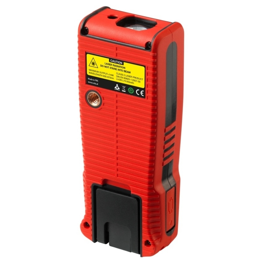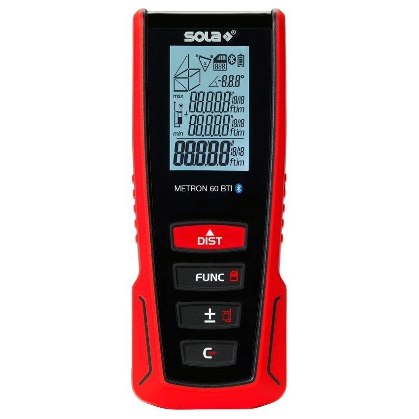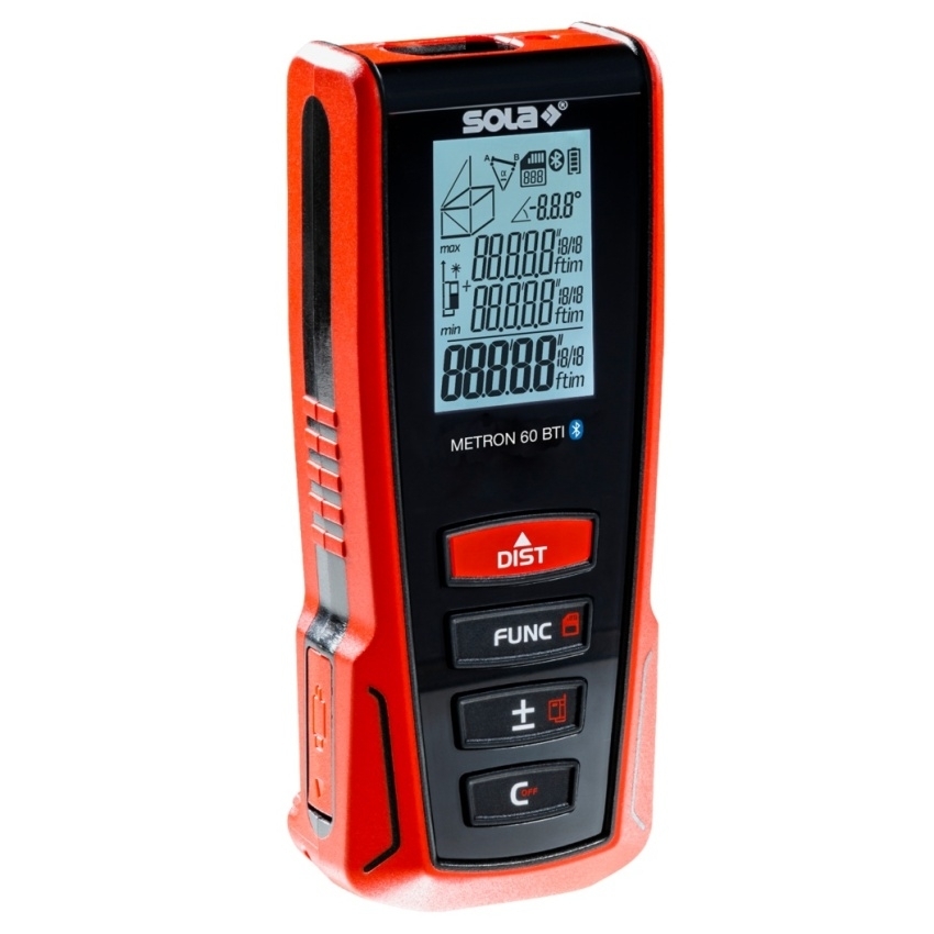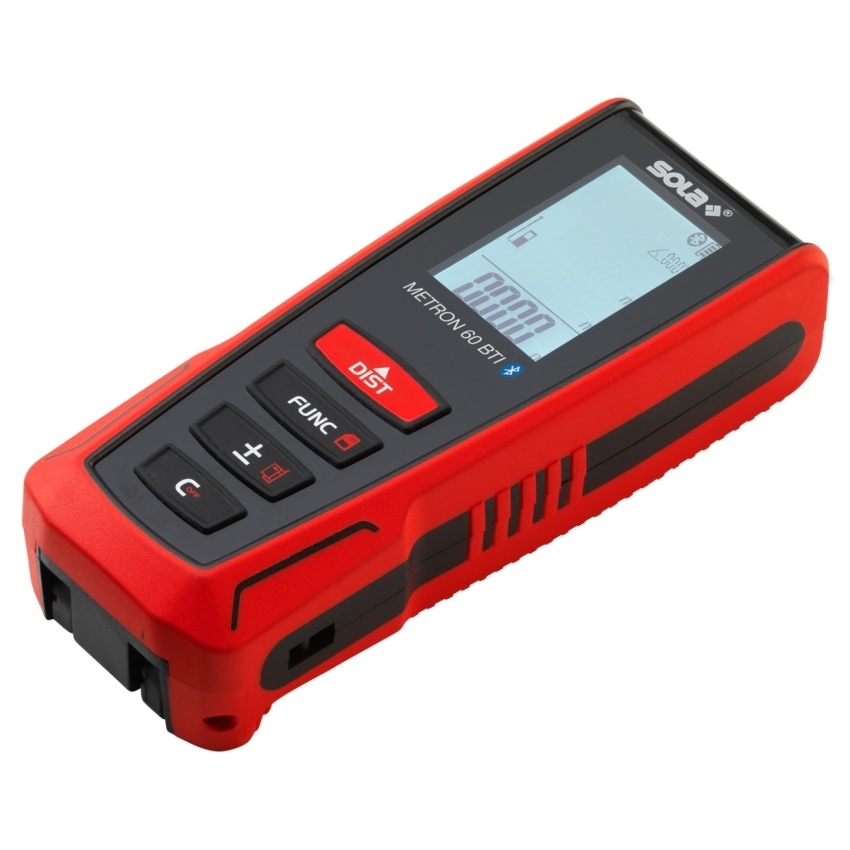 METRON 60 BTI má rozhraní Bluetooth pro použití aplikace SOLA Measures, funkci „Sdílení“, snímač sklonu pro nivelaci a měření úhlů, třířádkový podsvícený displej, výklopnou koncovku pro měření od vnější hrany a funkci malování. Aplikace: měření délky, měření plochy, měření objemu, měření minima / maxima, trvalé měření, nepřímé měření 3 bodů, nepřímé měření 2 bodů, přičítání / odečítání, automatické měření délky, funkce malování. Technická data: rozměry 119 x 46 x 28 mm, tolerance měření ±1,50 mm, provozní teplota 0 až +40 °C, upevnění stativu 1/4", stupeň krytí IP54, napájení lithium-iontový akumulátor 3,7 V (850 mAh), doba provozu (při 20 °C) 5000 měření, laserová třída 2 (DIN EN 60825-1 : 2007-10), výstupní výkon < 1,0 mW, vlnová délka 635 nm, skladovací teplota -20 °C až +60 °C, dosah 0,05 - 60 m. Přednosti: paměť naměřených hodnot (30 naměřených hodnot), závit 1/4" pro upevnění na stativ, automatické vypínání, měkká rukojeť a ergonomický design.