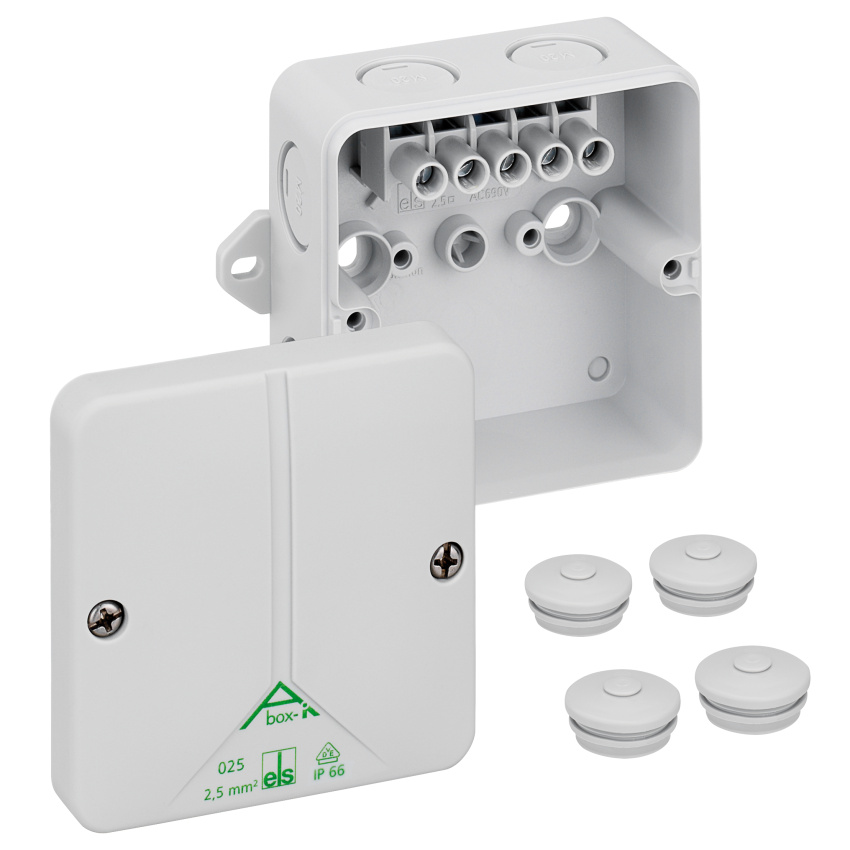 Spojovací krabice - průmyslová kvalita - podle DIN EN 60670 (VDE 0606), Ui=690V, odolná vůči povětrnostním podmínkám, nárazuvzdorné, s průchodkami, M20, s dvojitou membránovou vývodkou IP66, s vnějšími úchyty, s krytím IP66, do 2,52, nárazuvzdornost IK08, třída ochrany II, VDE zkouška, bez halogenů, certifikace DLG, 82 x 82 x 52 mm, šedá, se šroubovou svorkou, 5 pólů - 2,5 mm2 (4 x 1,52 / 4 x 2,52).
