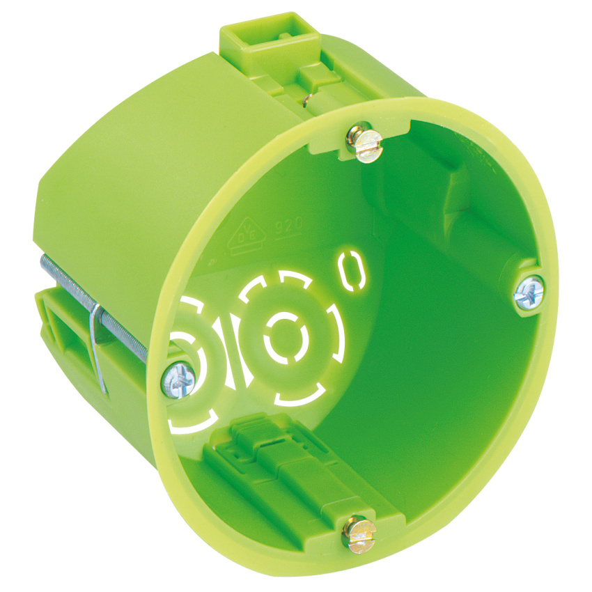 Krabice do dutých stěn, samozhášivá, univerzální krabice pro tloušťku desek 1 až 40 mm, s integrovaným patentovaným spojovacím můstkem, včetně děrovacího nástroje, rozteč šroubů pro montáž přístrojů 60 mm, s krytím IP30, VDE zkouška, 50 x 68 mm, vyvrtaný otvor průměr 68 mm, hloubka 50 mm, s nastříkanými, patentovanými kombinovanými můstky.