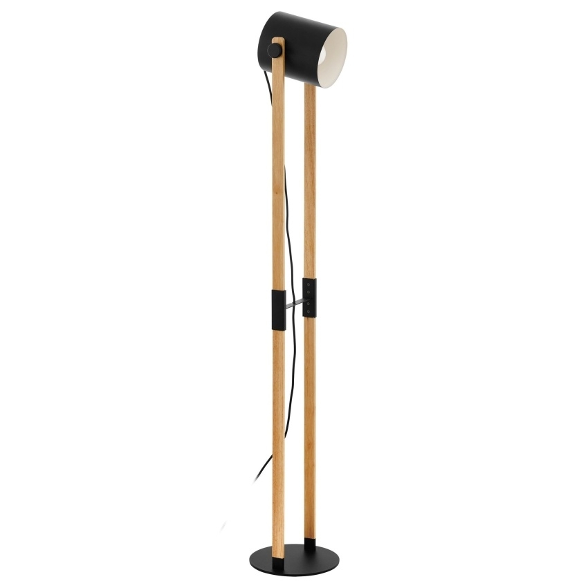 Stojací svítidlo Eglo HORNWOOD v kombinaci černého kovu, krémových detailů a přírodního borovicového dřeva.