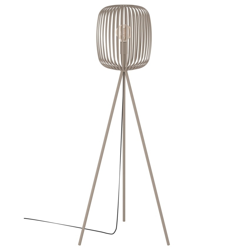 Stojací lampa EGLO ROMAZZINA v pískové barvě s kovovým stínidlem a třínohým podstavcem, vhodná pro žárovku E27.