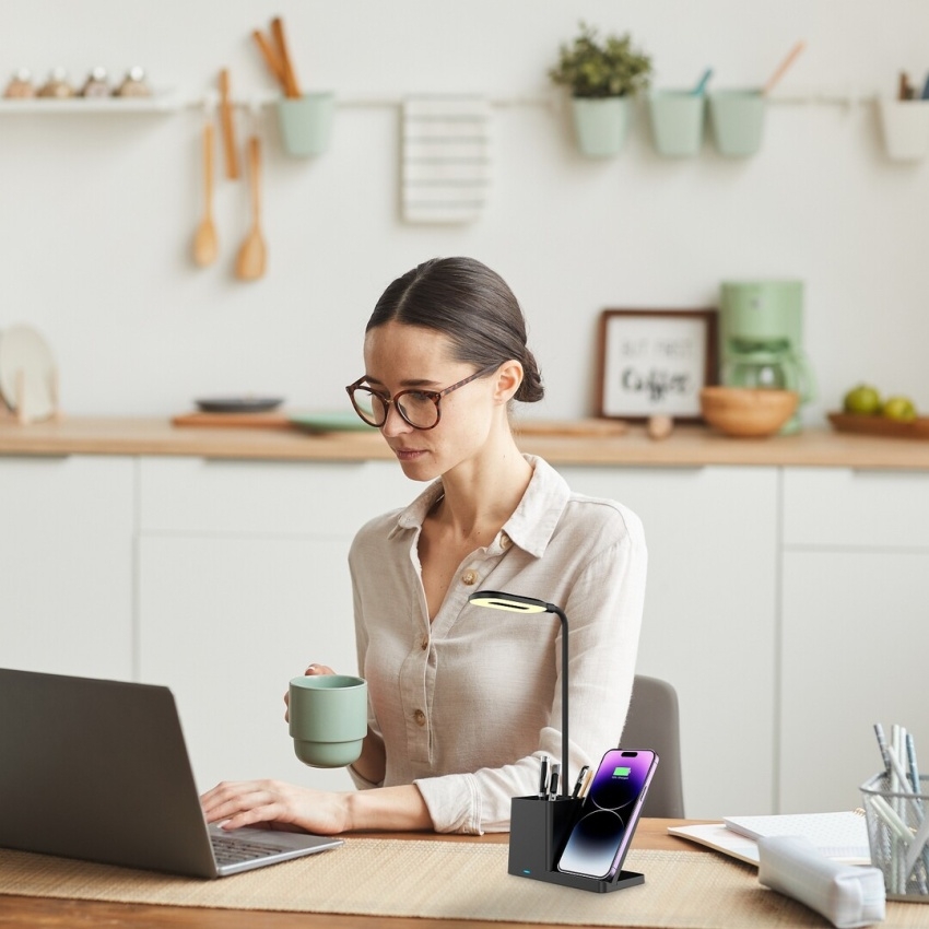 - Držák na pero a telefon s bezdrátovým nabíjením