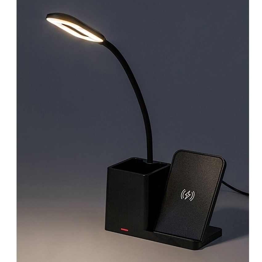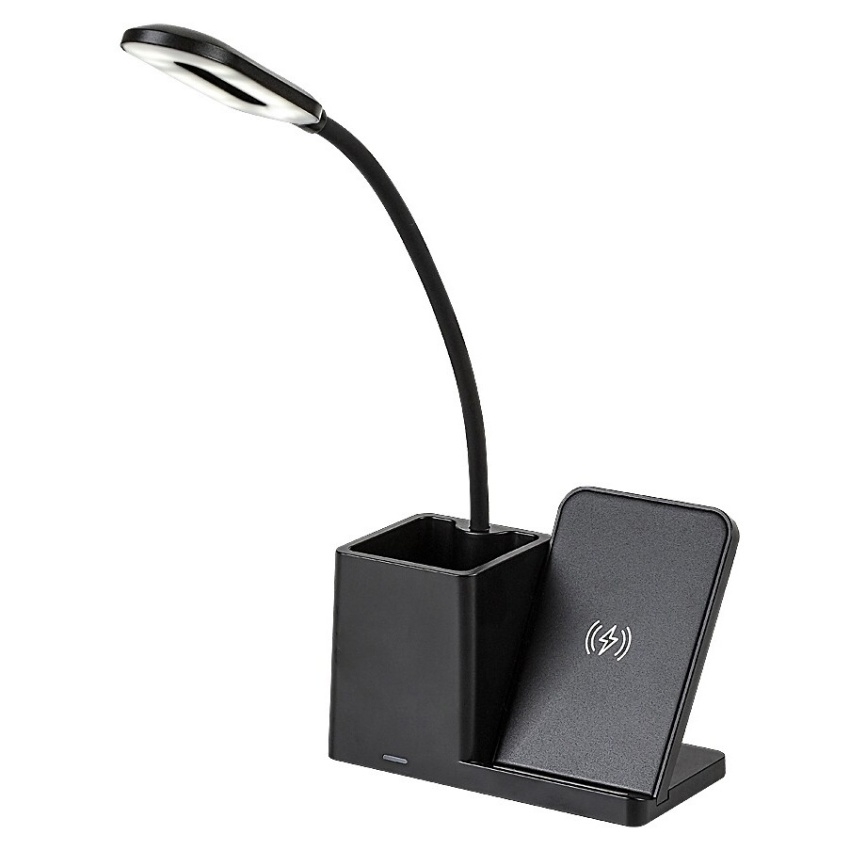 Stolní LED lampa Rabalux Cerie 74232 v moderním černém provedení kombinuje elegantní design s praktickými funkcemi. Plastové tělo lampy doplňuje bílé stínítko a kompaktní základna s integrovaným držákem na pero a mobilní telefon, který zároveň umožňuje bezdrátové nabíjení kompatibilních zařízení. Lampa nabízí možnost nastavení teploty světla v rozmezí 3000–6500 K a regulaci jasu ve třech úrovních pomocí dotykového spínače umístěného na hlavě lampy. Vestavěný LED světelný zdroj s výkonem 4 W poskytuje světelný tok 200 lm (320 lm bez stínítka) a díky technologii LED zajišťuje energeticky úsporný provoz i dlouhou životnost. Stolní lampa Cerie je ideální volbou do pracovny nebo dětského pokoje.