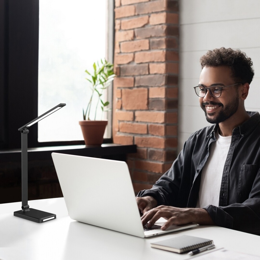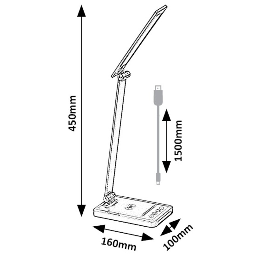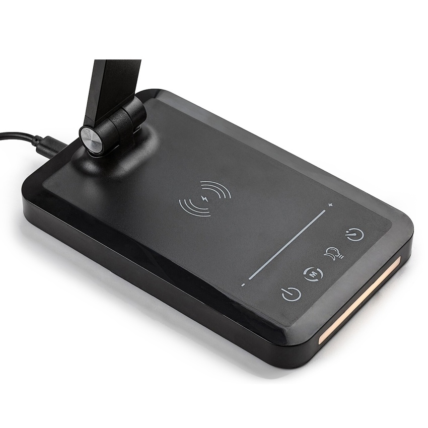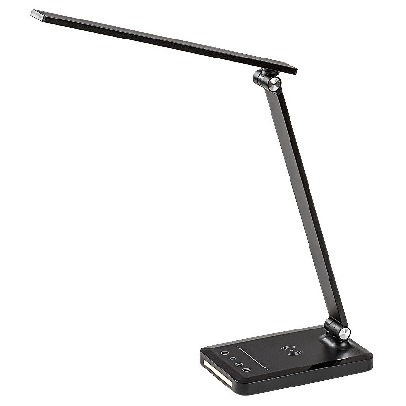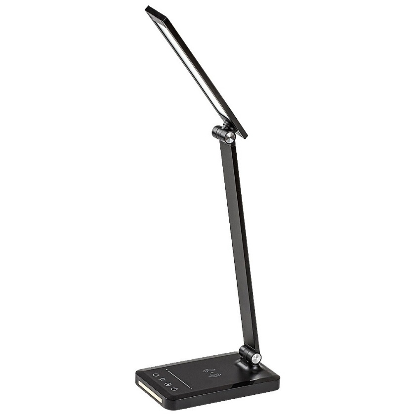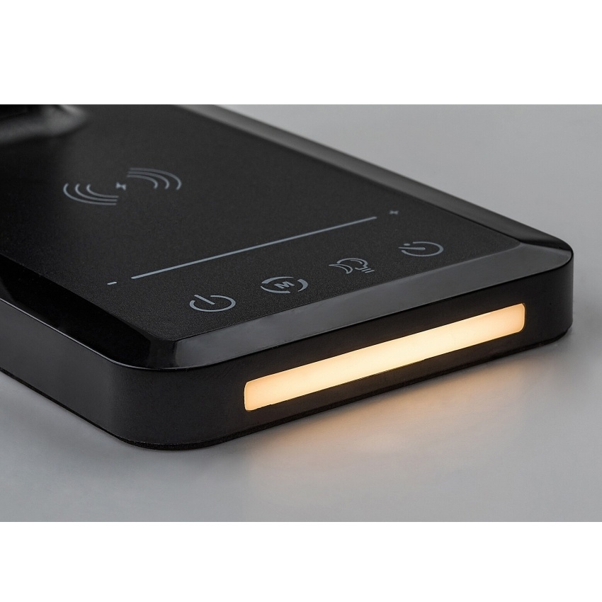 Stolní LED lampa Rabalux Traze 74213 v elegantní černé barvě je moderním a multifunkčním doplňkem pracovního stolu nebo dětského pokoje. Kombinace kovu a plastu působí stylově a současně prakticky. Lampa disponuje vestavěným LED světelným zdrojem o výkonu 5 W se světelným tokem 190 lm (560 lm bez stínítka) a nastavitelnou teplotou světla v rozsahu 3000–6500 K. Pomocí dotykového spínače lze snadno regulovat jas, barvu světla i další funkce, mezi které patří paměť, časovač automatického vypnutí a režim nočního osvětlení. Model je dále vybaven USB portem pro nabíjení mobilních zařízení a podporuje i bezdrátové nabíjení kompatibilních telefonů (QI standard). Díky úsporné LED technologii nabízí dlouhou životnost a velmi nízkou spotřebu energie.