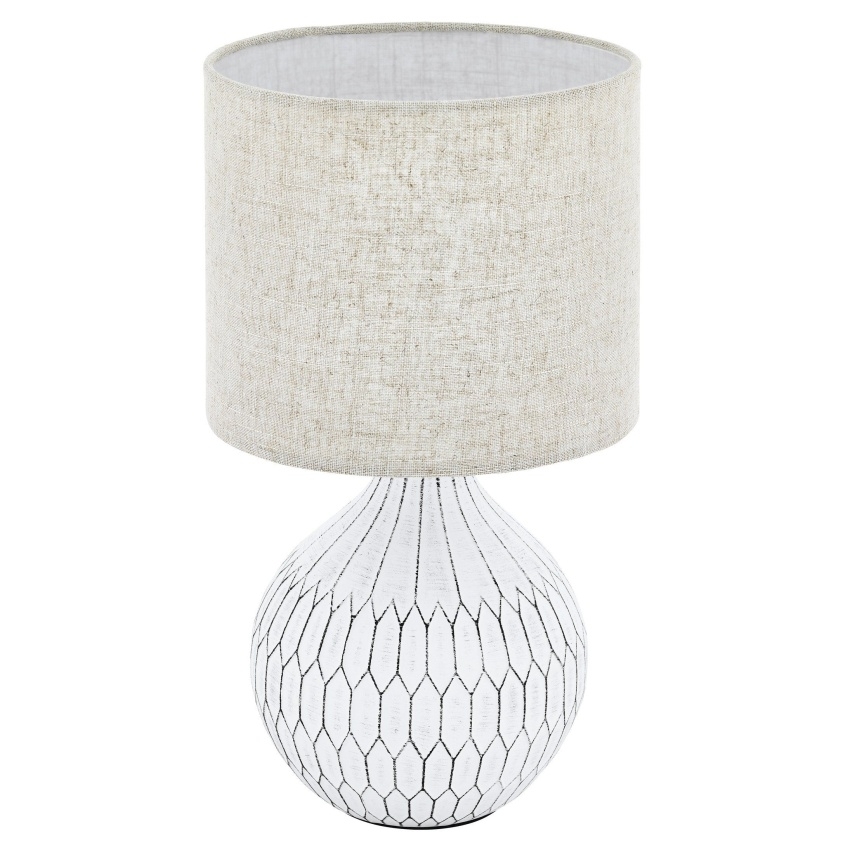 - Elegantní kombinace bílé keramiky a světle hnědého textilního stínidla
