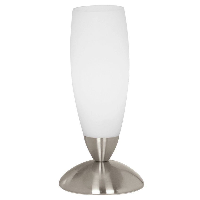 Moderní stolní svítidlo EGLO SLIM v kombinaci matného niklu a bílého skla s paticí E14.