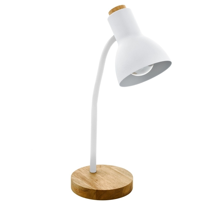 Stolní svítidlo EGLO VERADAL 98832 v bílé a hnědé barvě s kombinací kovu a dřeva, paticí E27 a kolébkovým vypínačem.