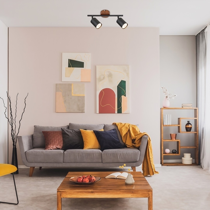 Dvojité bodové svítidlo Rabalux Edmund 5296 v industriálním stylu kombinuje kov v černé barvě s dekorem přírodního dřeva a přináší do interiéru moderní, ale přitom hřejivý vzhled. Je ideální pro obývací pokoj, ložnici nebo pracovnu, kde poskytne směrovatelné a cílené osvětlení. Kovová nosná tyč je uchycena ke kulaté základně v odstínu dubu, na níž jsou připevněna dvě otočná válcová stínítka. Svítidlo je určeno pro dvě žárovky s paticí GU10 (max. 25 W) a dodává se bez světelných zdrojů.