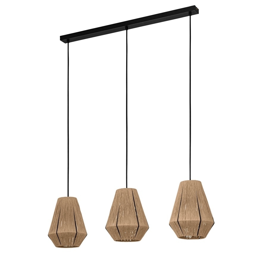 Závěsné svítidlo EGLO ALDERNEY je stylovou kombinací moderního designu a přírodních materiálů. Tři drátěná stínidla ve tvaru diamantu jsou omotána konopnou přízí v přírodní barvě, což vytváří originální vzhled a hru světla a stínu. Svítidlo je zavěšeno na černém textilním kabelu a ideálně se hodí nad jídelní stůl, do obývacího pokoje nebo kuchyně. Díky standardní patici E27 si můžete zvolit typ žárovky podle vlastních preferencí. Žárovky nejsou součástí balení.
