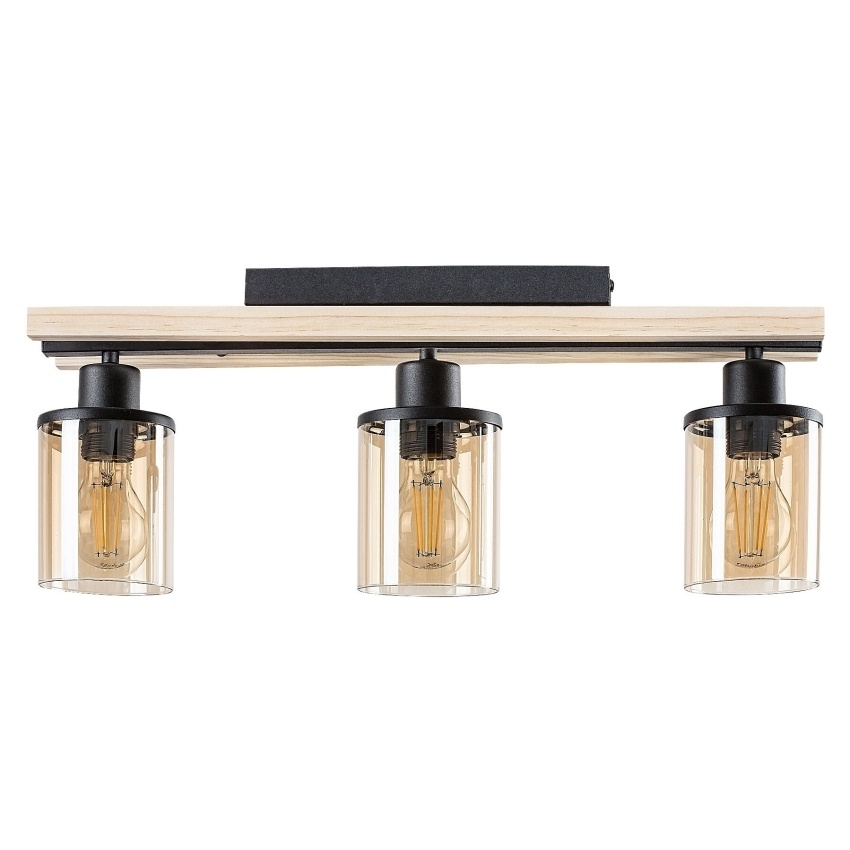 - Moderní trojité stropní svítidlo v kombinaci černého kovu, dřeva a jantarového skla