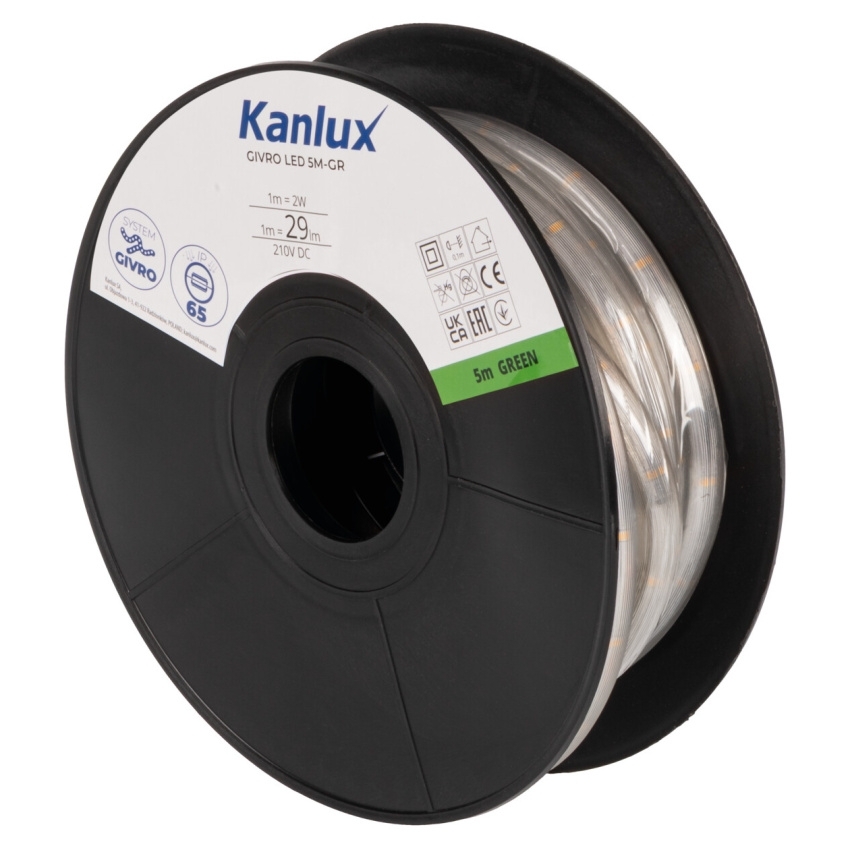 Kanlux GIVRO LED je bezpečný a pohodlný světelný had, jehož způsob spojování jednotlivých úseků zajišťuje spolehlivost a komfort při používání. Díky vysokému stupni krytí IP65 jsou hady GIVRO chráněny proti vnikání prachu a vlhkosti a jejich odolnost vůči UV záření zaručuje dlouhodobé zachování vlastností. Jsou dostupné v pěti délkách (5, 10, 15, 30, 50 m) a šesti barevných variantách teplé (3000K), neutrální (4000K), studené (6500K) a také červené, zelené a modré. Světelné hady Kanlux GIVRO LED lze spojovat až do délky 100 metrů, přičemž průběžné napájení usnadňuje vytváření rozsáhlých instalací. V případě potřeby je možné had přestřihnout ale pro samostatné použití je vhodný pouze úsek zakončený vidlicí, přičemž zkrácený konec je třeba zabezpečit koncovkou GIVRO END CAP. Volitelné příslušenství zahrnuje připojovací kabel GIVRO-PR SET (150 cm, IP44, zakončený vidlicí) a GIVRO-PR SET W/O PLUG (150 cm, IP65, bez vidlice), koncovky GIVRO END CAP a úchyty GIVRO HOLDER (10 kusů v balení) pro snadnou montáž světelných hadů.