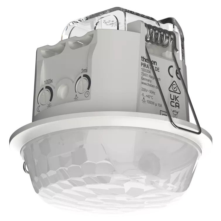 THEBEN PIRA TC DE je stropní PIR čidlo určené pro interiérové aplikace, které zajišťuje spolehlivou detekci pohybu v rozsahu 360° na ploše až 25 × 3 m. Díky smíšenému měření světla čidlo automaticky spíná osvětlení podle přítomnosti osob i aktuální světelné situace v místnosti. Je vybaveno jedním spínacím výstupem (230 V AC) a podporuje různé typy svítidel včetně LED s maximálním výkonem 200 W.