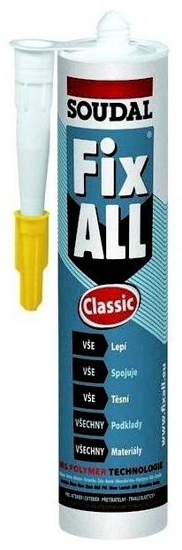 FIX ALL CLASSIC SOUDAL Fix All Classic je neutrální vysoce kvalitní pružný lepicí tmel, vhodný pro tmelení, lepení a spojování širokého spektra materiálů v interiéru i exteriéru, veškeré tmelení a lepení savých i nesavých materiálů v domácnosti, na stavbě nebo automobilu. Fix All Classic nahrazuje většinu dostupných tmelů a lepidel. Výborně přilne na běžné materiály: beton, omítky, přírodní i umělý kámen, dřevo, dřevotříska, laminát, plasty, polystyren, PVC, korek, minerální i skelná vata, železo, olovo, zinek, měď, hliník, sklo, obklady a dlažby, sanitární keramika, porcelán, zrcadla a mnoho dalších.