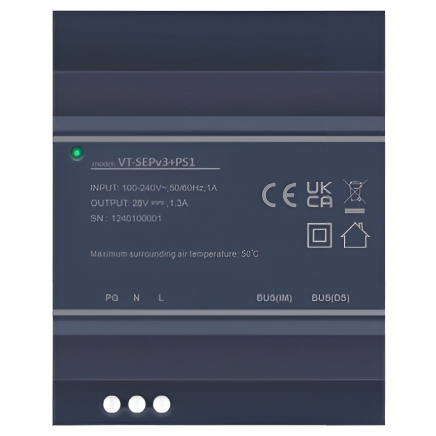 VT-SEPv3+PS1 – napájecí zdroj se směšovačem napětí a dat určený pro videotelefony V-LINE. Montáž na DIN lištu, výstupní napětí 28 V DC / 1,3 A. Napájení 230 V AC / 1 A.