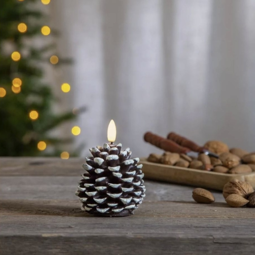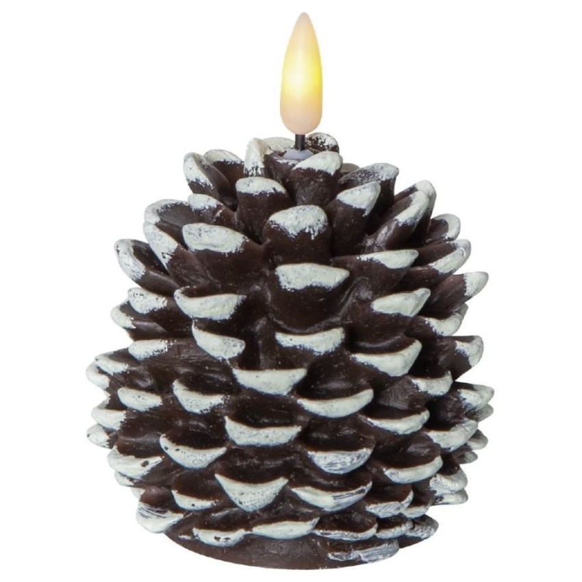 LED svíčka EGLO FLAMME CONE STAR 062-68 ve tvaru šišky v hnědém provedení. Vyzařuje teplé bílé světlo s realistickým plamenným efektem a vytváří útulnou vánoční atmosféru v interiéru.