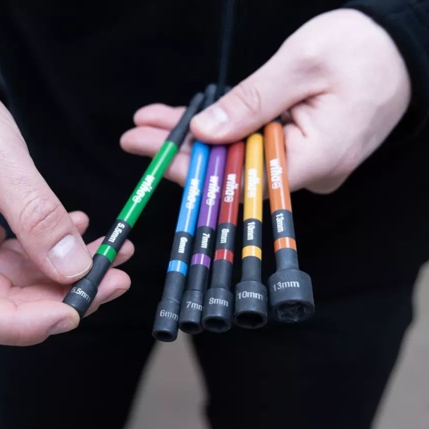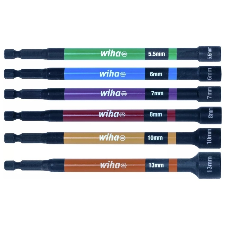 Sada nástrčných klíčů WIHA 47035 obsahuje 6 barevně rozlišených magnetických nástrčných klíčů ve velikostech 5,5 / 6 / 7 / 8 / 10 / 13 mm. Barevný povrch umožňuje rychlou identifikaci správné velikosti a magnetické uchycení usnadňuje práci tím, že pomáhá zabránit vypadnutí a ztrátě šroubů. Nástrčné klíče jsou vyrobeny z chrommolybdenové oceli, mají nárazuvzdornou konstrukci a jsou vhodné pro strojní šroubování šestihranných šroubů až do točivého momentu 79 Nm i pro ruční šroubování. Díky celkové délce 150 mm jsou určené i pro hůře přístupná místa a hluboko uložené šrouby; rozměry výrobku jsou 192 × 110 × 24 mm.