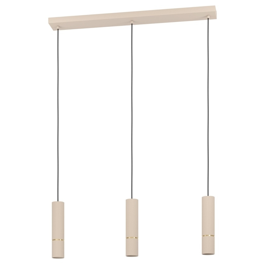 Elegantní závěsné svítidlo EGLO Caminia 901152 vyniká moderním designem s úzkými válcovými světelnými hlavicemi. Kovové tělo v pískové barvě doplněné o detaily v kartáčované mosazi působí stylově a luxusně, takže se hodí nad jídelní stůl, kuchyňský ostrůvek nebo do reprezentativních prostor. Díky třem paticím GU10 poskytuje dostatek světla a rovnoměrné nasvícení plochy. Součástí balení jsou i LED světelné zdroje s výkonem 3×5 W. Svítidlo je určeno pro interiérové použití s krytím IP20.