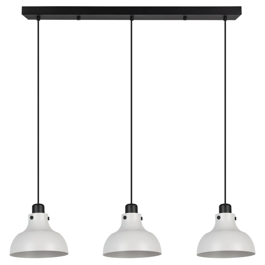 Závěsné svítidlo EGLO MATLOCK přináší moderní industriální styl do vašeho interiéru. Tvoří jej tři kónická stínidla v elegantní světle šedé barvě, která jsou doplněna černými kovovými nástavci a jemnými detaily. Díky svému podlouhlému tvaru je ideální pro umístění nad jídelní stůl, kuchyňský ostrůvek či do obývacího pokoje. Žárovky nejsou součástí balení, určeno pro patici E27.