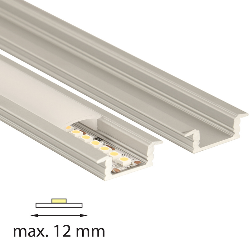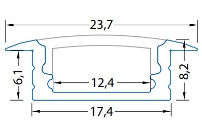 Vestavný hliníkový profil pro LED pásky, rozměry průřezu cca 24x8 mm. Součástí je mléčný difuzor, který lze do profilu nacvaknout. Tento profil je určen pro krytí a chlazení LED pásků do šíře 12 mm. Upevnění k podkladu lze provést pomocí vrutů, lepidel.