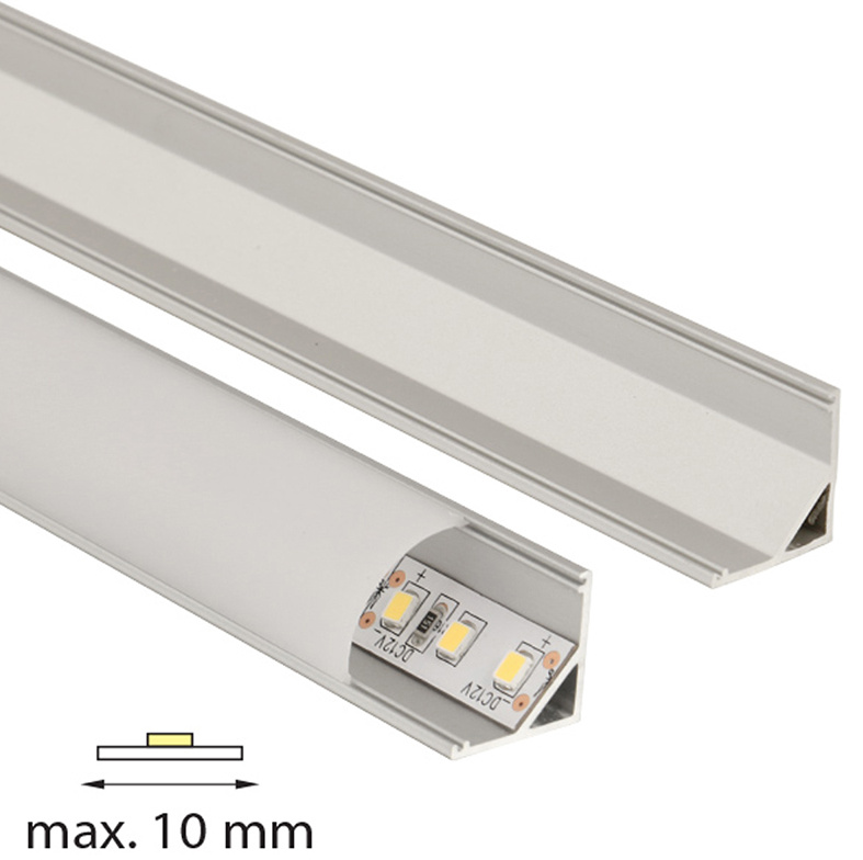 McLED Rohový hliníkový profil pro LED pásky, rozměry průřezu cca 16x16 mm. Součástí je mléčný difuzor, který lze do profilu nacvaknout. Tento profil je určen pro krytí a chlazení LED pásků do šíře 10 mm. Upevnění k podkladu lze provést pomocí montážních úchytů, vrutů, lepidel. K profilu lze zakoupit úchyty a koncovky.