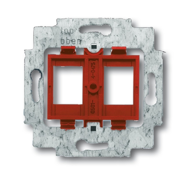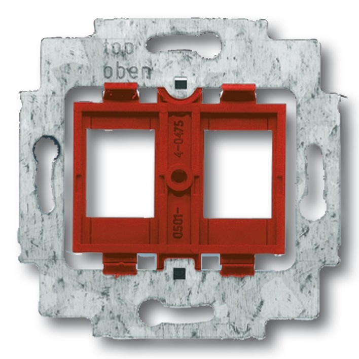 Třmen se soklem pro upevnění dvou komunikačních zásuvek typu Modular-Jack (keystone). Rozměry otvorů: 19,4 × 14,8 mm. Do soklu lze zabudovat též např. zásuvky keystone firem AMP, Panduit aj.