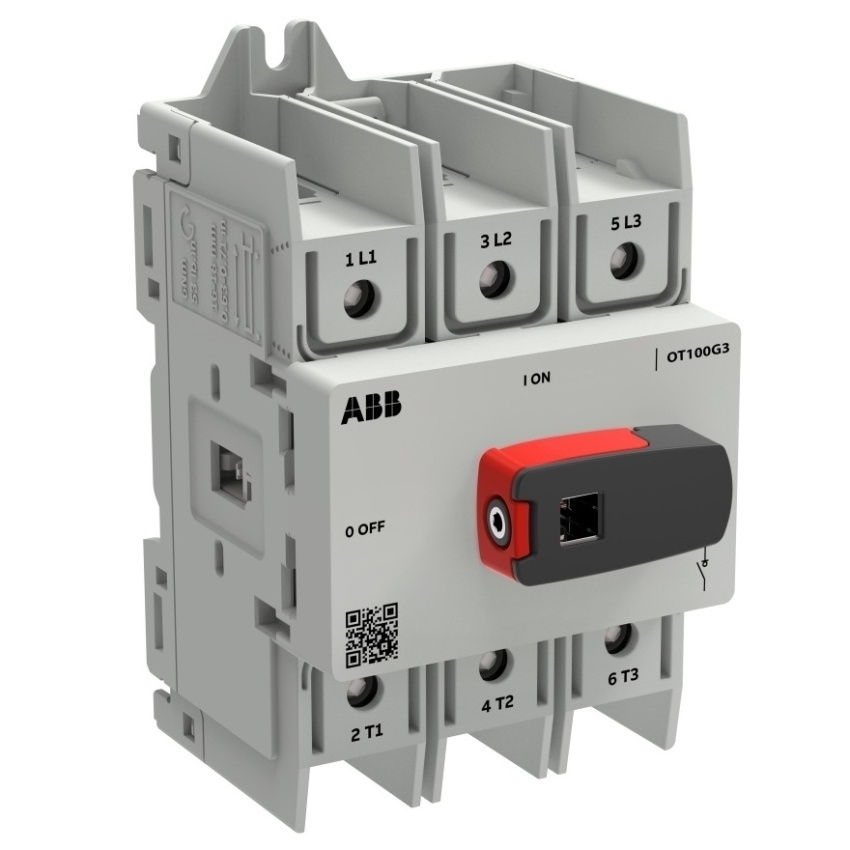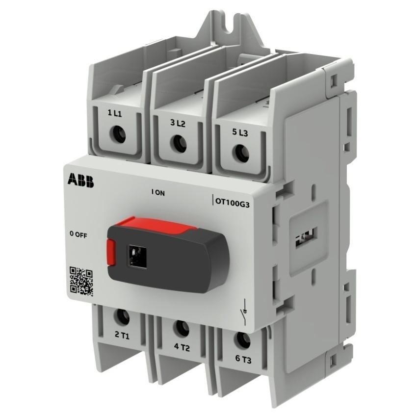 Spínač odpojovač OT100G3-3BS z řady OT Plus je třípólový přístroj určený pro montáž na DIN lištu s výřezem 45 mm. Ovládání je řešeno předním knoflíkem, který lze přímo namontovat a zajistit zámkem pro bezpečnost. Svorky jsou šroubovací a umožňují snadné připojení vodičů. Navíc je možné připojit hřídel pro ovládání z vnější strany panelu.