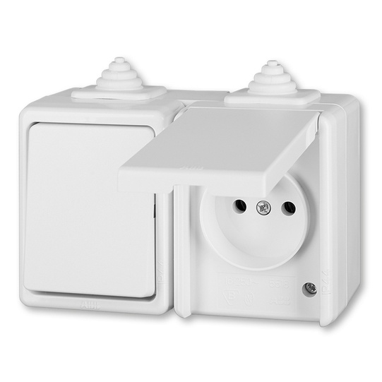 Kombinace přepínače střídavého a zásuvky s ochranným kolíkem a víčkem, IP 44