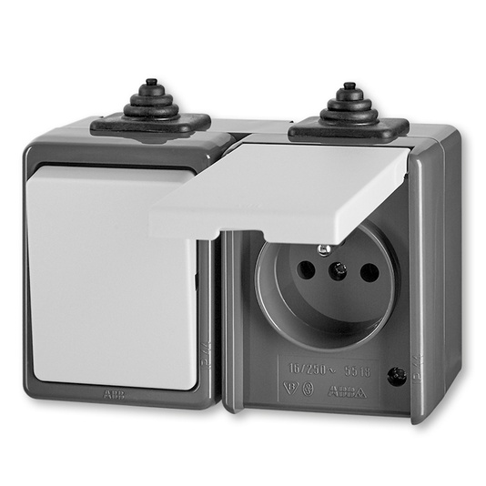 ABB PRAKTIK 3932-20062 S KOMBINACE PŘEPÍNAČE STŘÍDAVÉHO A ZÁSUVKY JEDNONÁSOBNÉ IP44 ŠEDÁ