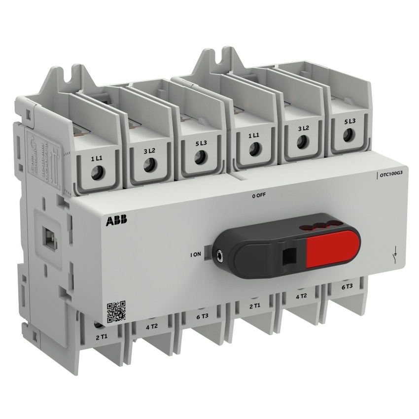OTC100G3-3BS je 3pólový přepínač OT Plus s předním ovládáním a montáží na DIN lištu. Disponuje vestavěnými šroubovacími svorkami a přímým knoflíkem s možností zajištění visacím zámkem.