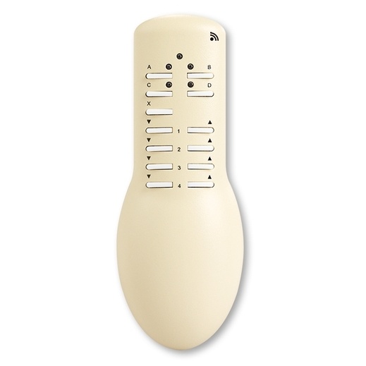 Bezdrátové dálkové ovládání, Radiofrekvenční (RF) ovládání - vysílače, Vysílač ruční, vícekanálový, slonová kost, Pro ovládání čtyř RF přijímačů (nebo až 16 přijímačů ve 4 skupinách).