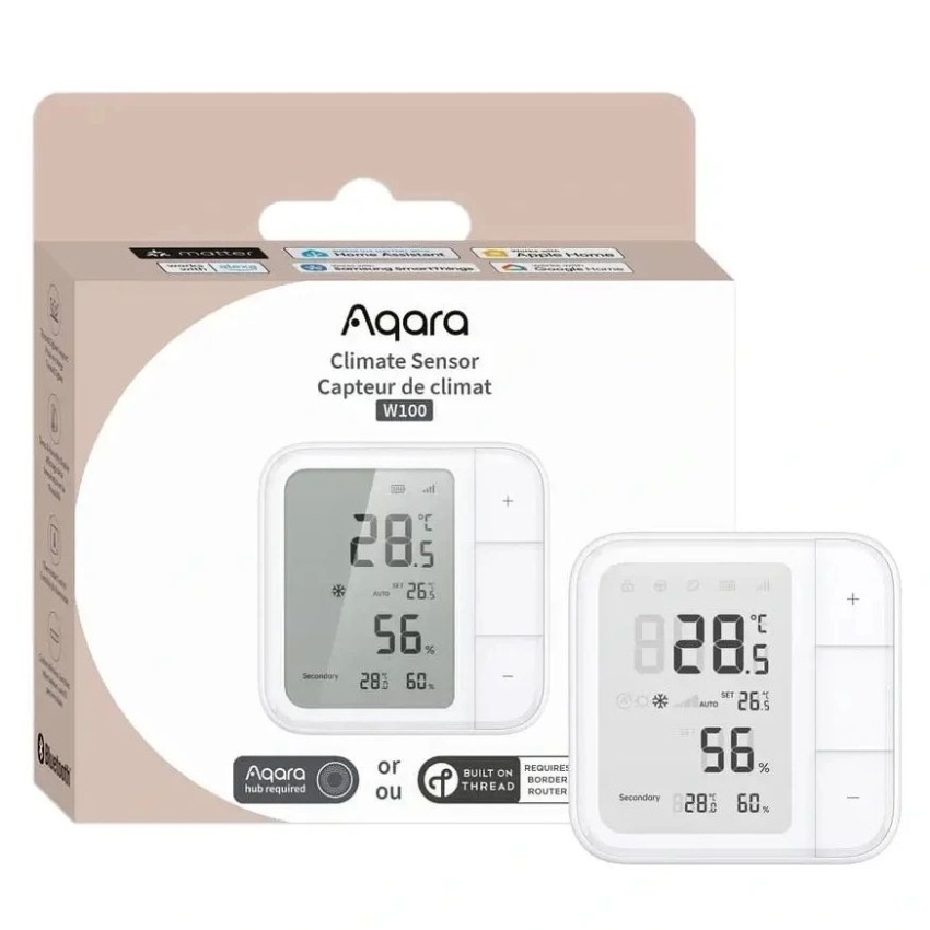 AQARA Climate Sensor W100 (TH-S04D) monitoruje teplotu a vlhkost v reálném čase s přesností ±0,2? a ±2%RH. Zařízení podporuje duální bezdrátové protokoly Zigbee a Thread s kompatibilitou Matter, což umožňuje integraci s ekosystémy jako Apple Home, Amazon Alexa a Google Home. S třemi přizpůsobitelnými tlačítky lze spustit až devět automatizací, a senzor lze připojit k Aqara hubu pro rozšířené funkce včetně dálkového ovládání HVAC systémů. Napájí se dvěma bateriemi CR2450 s dlouhou výdrží a nabízí možnost integrace externích senzorů pro zobrazení dodatečných environmentálních dat.
