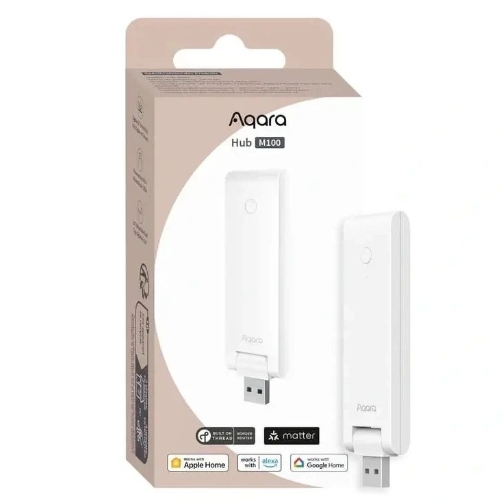 AQARA Hub M100 (HM-G02D) umožňuje propojení až 20 Zigbee zařízení nebo až 40 podzařízení různých typů (Zigbee, Thread, Wi-Fi) do jedné sítě s rychlostí Wi-Fi 6 na frekvenci 2,4 GHz. Slouží jako Matter Bridge i Matter Controller a podporuje lokální automatizaci pomocí technologie Ark 2.0. Zařízení je vybaveno USB-A portem pro napájení 5V 0.5A a funguje také jako Thread Border Router a Mesh Extender, čímž rozšiřuje dosah a spolehlivost sítě Thread.
