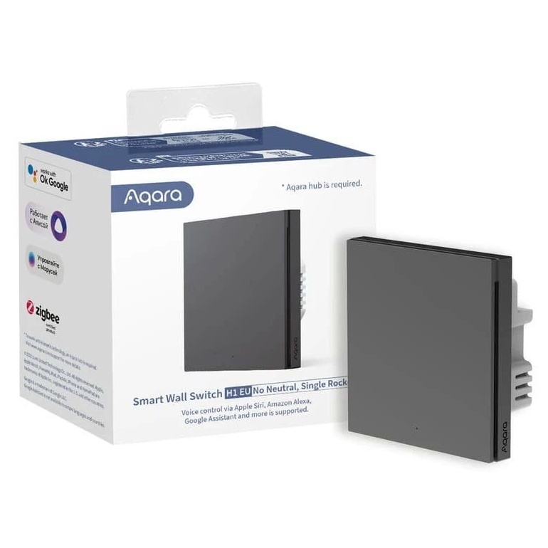 AQARA Smart Wall Switch H1 EU (No Neutral, Single Rocker) (WS-EUK01-G) umožňuje dálkové ovládání světel s maximálním zatížením 8 A a minimální zátěží 3 W. Vypínač komunikuje přes Zigbee 3.0 a je kompatibilní s řídící jednotkou Aqara Hub EU, která umožňuje integraci do systému Aqara Home a Apple HomeKit. Zařízení podporuje časované řízení, hlasové ovládání a ochranu proti přehřátí a přetížení, přičemž pasuje do standardní 45mm hluboké elektroinstalační krabice.