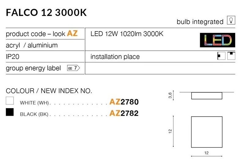Stropní přisazené svítidlo Falco 12 z kolekce moderního osvětlení značky Azzardo zaujme svým hranatým tvarem, jednoduchým designem a především svou funkčností díky integrovanému LED zdroji o příkonu 1 x 12 W se svítivostí až 1020 lm a teplotou chromatičnosti 3000K (neutrální žluté světlo).