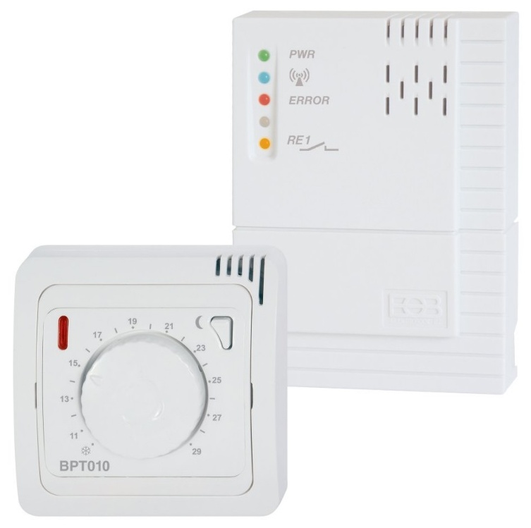 Bezdrátový termostat. Díky jednoduchému ovládacímu prvku a spolehlivé obousměrné komunikaci je BPT012 tou nejlepší náhradou klasického bimetalového termostatu. Vyšší komfort ovládání, moderní design a montáž bez sekání zdí a tažení vodičů jsou další přednosti, které Vás přesvědčí o modernizaci regulace Vašeho topného systému. Tento termostat má přijímač pro montáž na zeď. Tlačítko rychlé volby nočního útlumu (automatický pokles o 3°C po dobu 8-mi hodin). Další parametry: obousměrná komunikace, Vf výkon: <10 mW, hystereze: 0,4 °C, výstup přijímače: relé, max. 16 A.