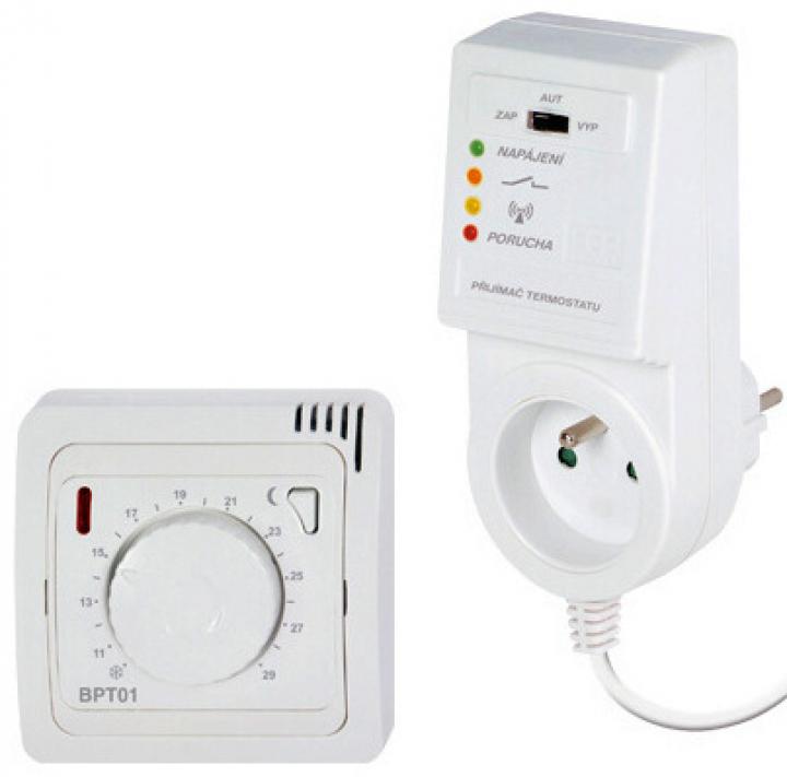 Bezdrátový termostat se systémem samoučení kódů, jednoduchým ovládáním pomocí kolečka a přijímačem do zásuvky