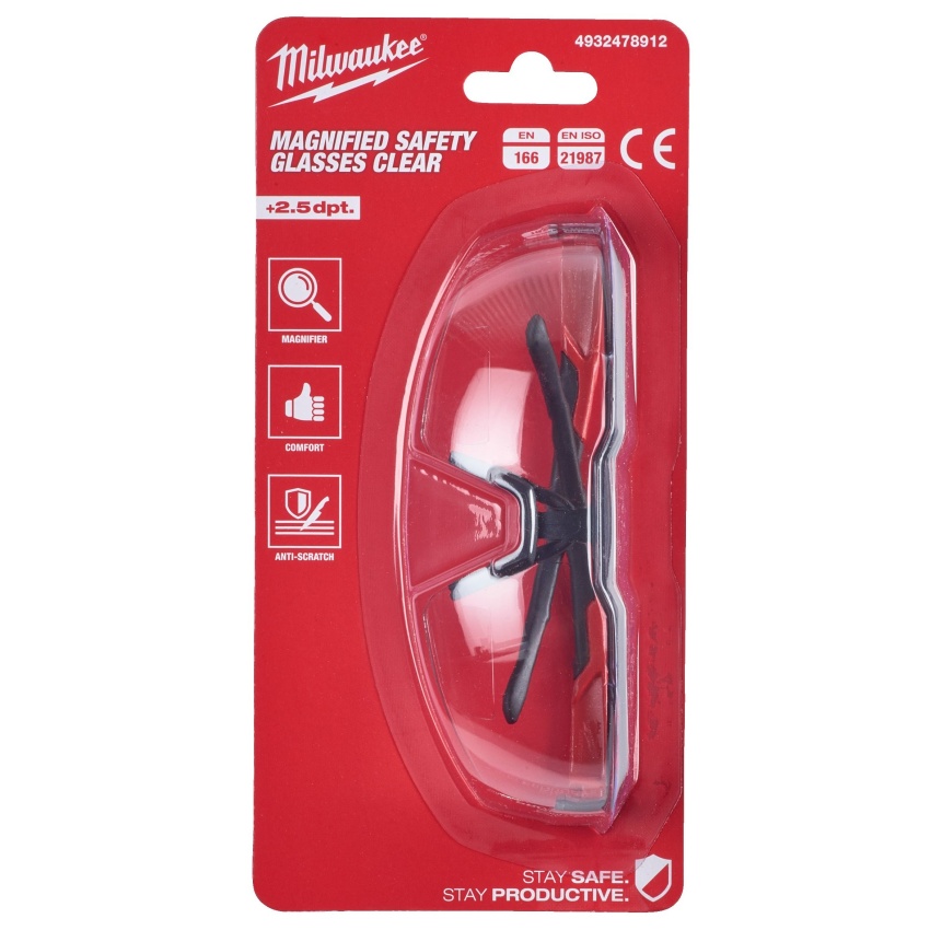 - Ochranné brýle MILWAUKEE, čiré, dioptrie + 2,5, odolné čočky s ochranou proti poškrábání.