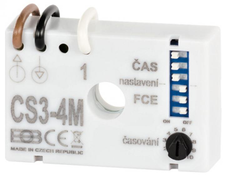 Multifunkční časový spínač. Spínač pod vypínač CS3-4M je v zapojení BEZ NULOVÉHO VODIČE a má možnost nastavení OSMI FUNKCÍ SEPNUTÍ. Vlastnosti: je multifunkční časové relé pro ovládání odporové (žárovky) a indukční zátěže (ventilátory) s možností montáže pod vypínač a v zapojení bez nulového vodiče. Funkce: časové zpoždění s možností přerušení, zpožděné vypnutí (obdoba CS3-1), multi-časové relé s blokováním, časové relé bez možnosti blokování, impulsní relé (ovládání z více míst), zpožděné sepnutí, zpožděné sepnutí i vypnutí, blikač.