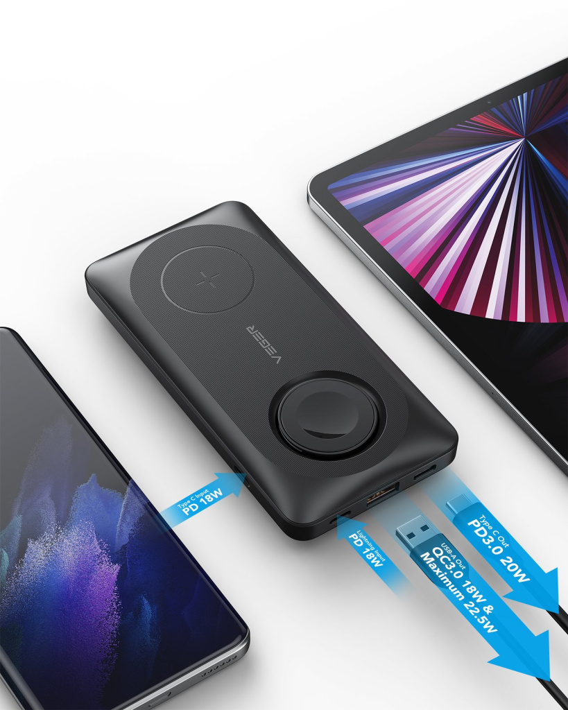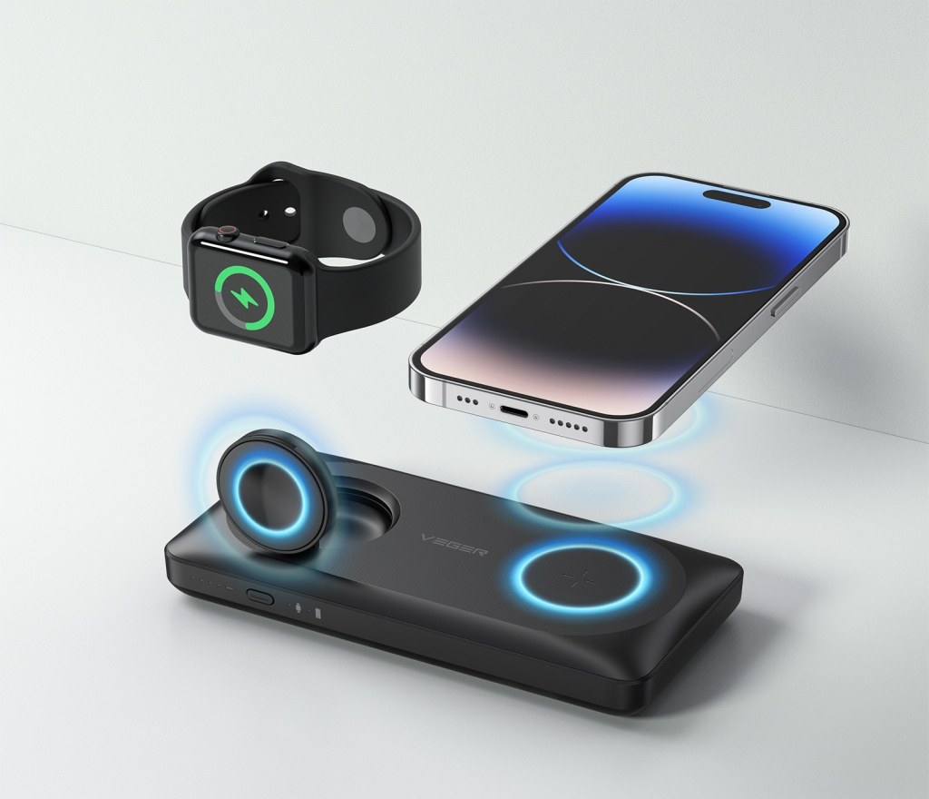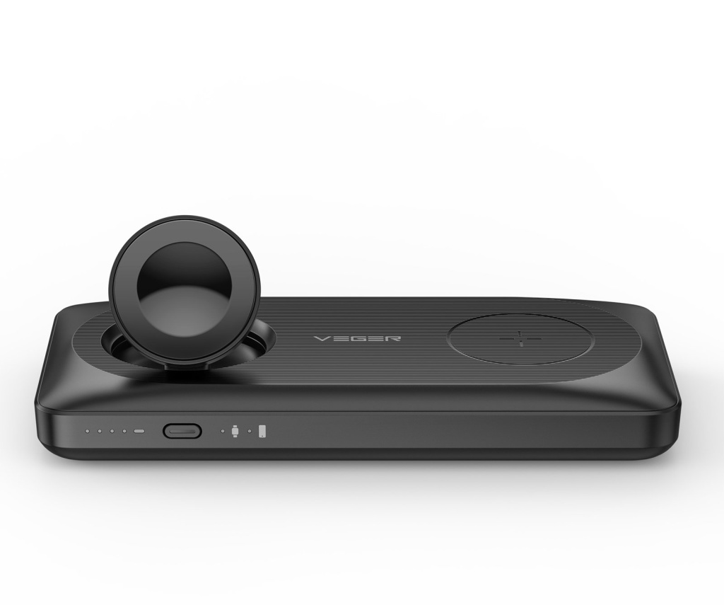 - VEGER W1156 je nejen multifunkční bezdrátová powerbanka 3v1 pro iPhone řady 12/13/14, Airpods a Apple Watch, ale také pro Android telefony další zařízení podporující technologie MagSafe a Qi. Funguje však také jako přenosná nabíječka PD20W 10000 mAh s běžnou funkcí powerbanky přes porty USB-A a USB-C.