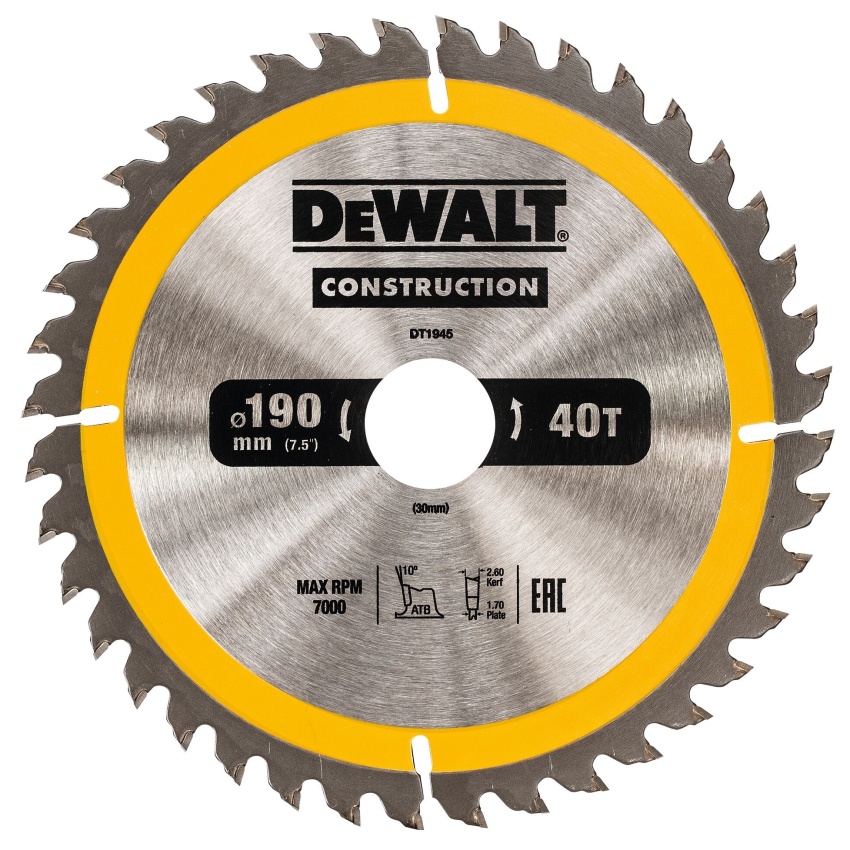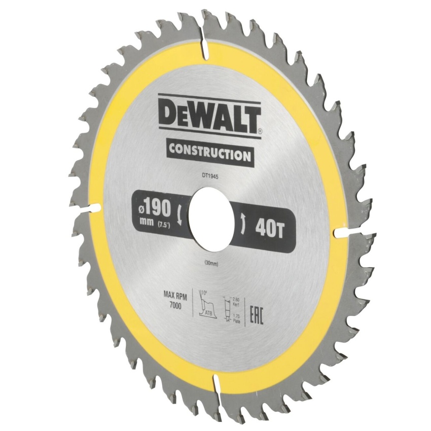 Pilový kotouč DeWALT CONSTRUCTION 190x30 mm, 40 zubů, ATB 10°, šířka kotouče 1,7 mm