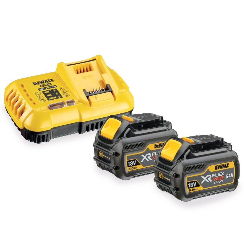 Sada dvou baterií DeWalt FlexVolt 54V/18V s kapacitou 2Ah/6Ah v balení s nabíječkou.