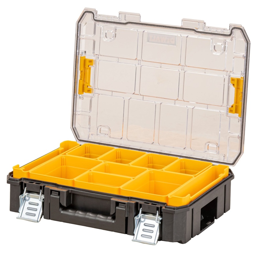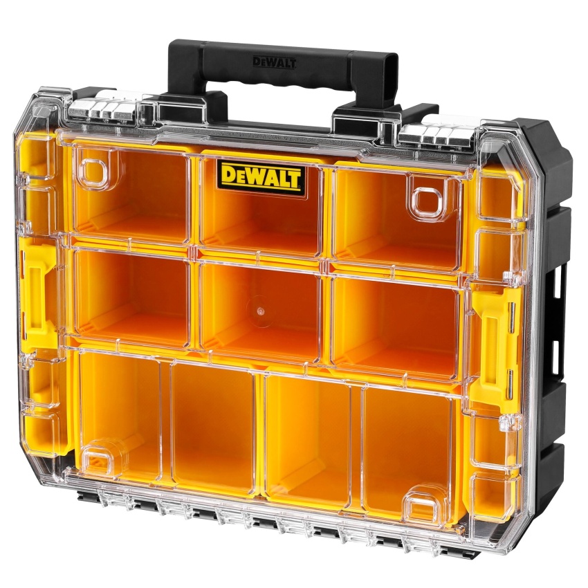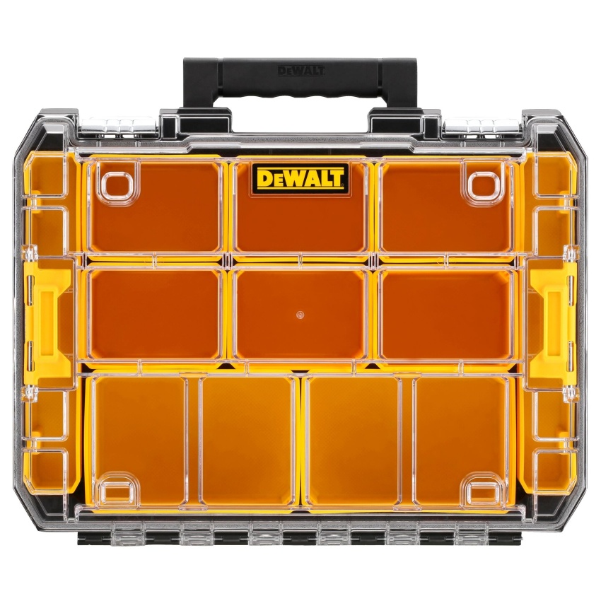 Organizér DeWalt TSTAK V je kompatibilní s řadou TSTAK a díky bočním stohovacím západkám jej lze bezpečně připojit k dalším modulům systému. Stupeň krytí IP54 pomáhá chránit uložený obsah před vniknutím vody a prachu. Průhledné polykarbonátové víko je navržené pro odolnost při běžném používání a zároveň umožňuje rychlou kontrolu obsahu bez otevírání. Objem 7,8 litru poskytuje prostor pro malé díly a příslušenství, zatímco ergonomická rukojeť usnadňuje pohodlné nošení.