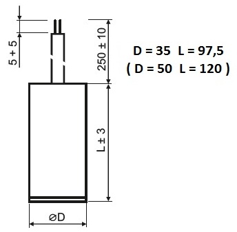 Kondenzátor 25uF/400V motorový běhový a rozběhový, kabel 250mm, bez uchycení