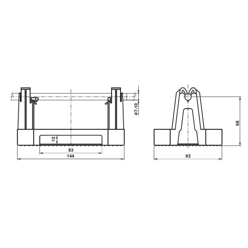 Držák podpěry upevnění vodiče na plochých střechách. Materiál plast ( PE se stabilizací proti UV záření). Šířka 144 mm, hloubka 92 mm a výška 66 mm