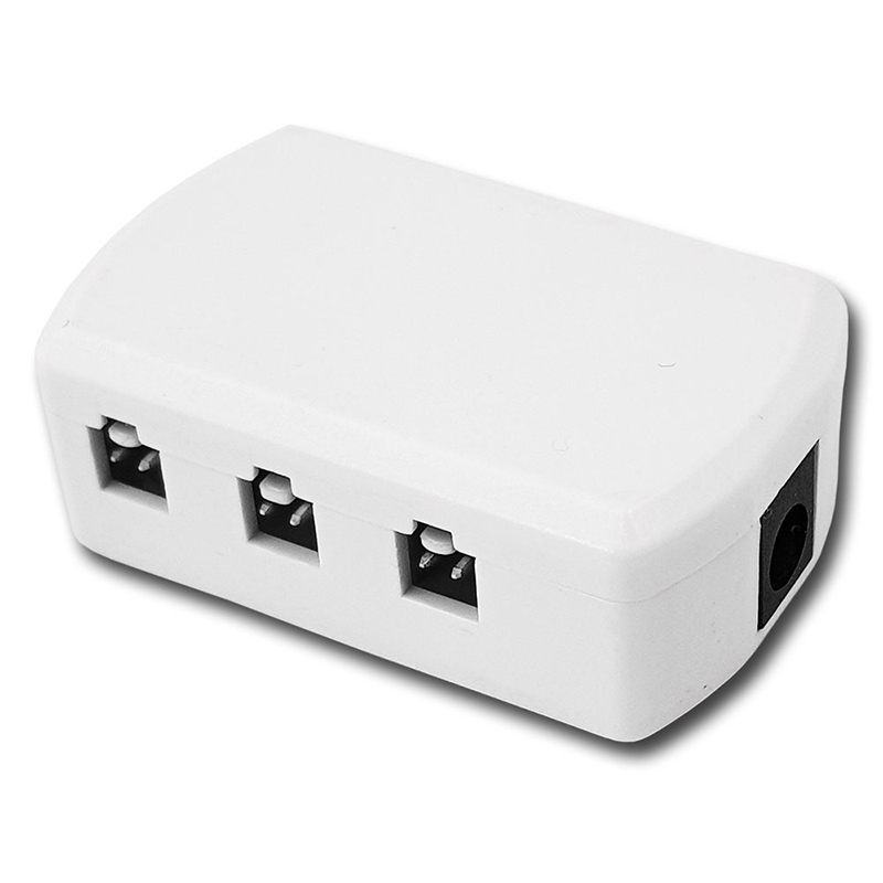 EasyLine MX6 rozbočovač 6pólový, 4A, vstup konektor 5,5 mm F, 6 x výstup DC konektor M. Ze spodní strany opatřen samolepkou, pomocí které lze rozbočovač upevnit.