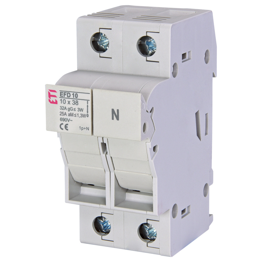 Pojistkový odpínač, efd 10 1p+n, připojení 1 - 25mm2, uchycení 35mm din lišta, počet pólů 1+n, jmenovité ac napětí (v) 690, jmenovitý proud (a) 32, velikost 10x38, třída použití ac 22b, nominal voltage v, mounting method other , for fuse size 10x38 mm , number of poles 2 , concurrently switching neutral conductor , lockable , with optical defect indication , width in number of modular spacings , built-in depth mm, degree of protection (ip)