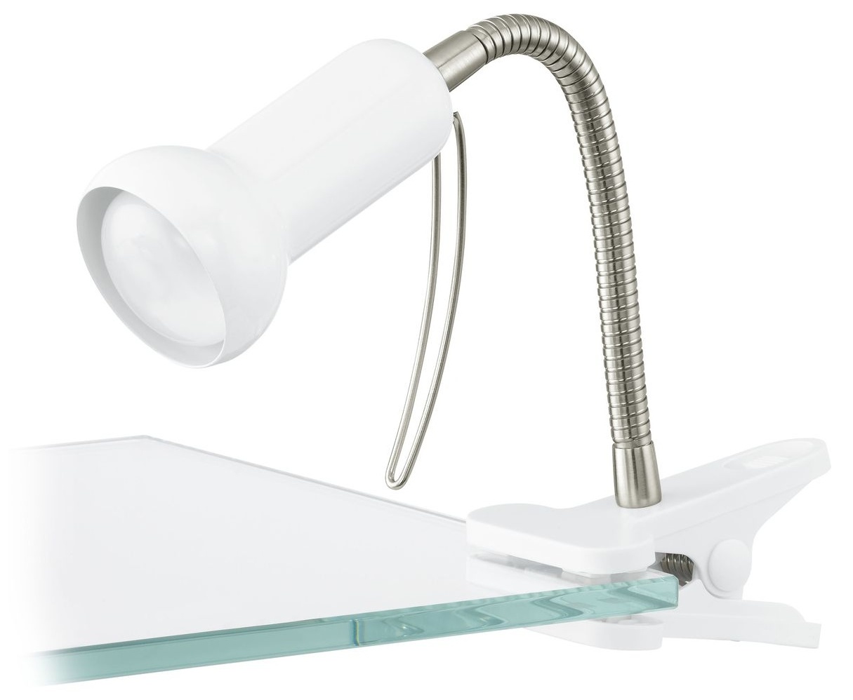 Toto klešťové svítidlo ze série FABIO je vyrobeno z bílé oceli a stříbrného plastu a ovládá se kabelovým vypínačem. Má ochrannou izolaci a pro svítivost potřebuje žárovku E14.